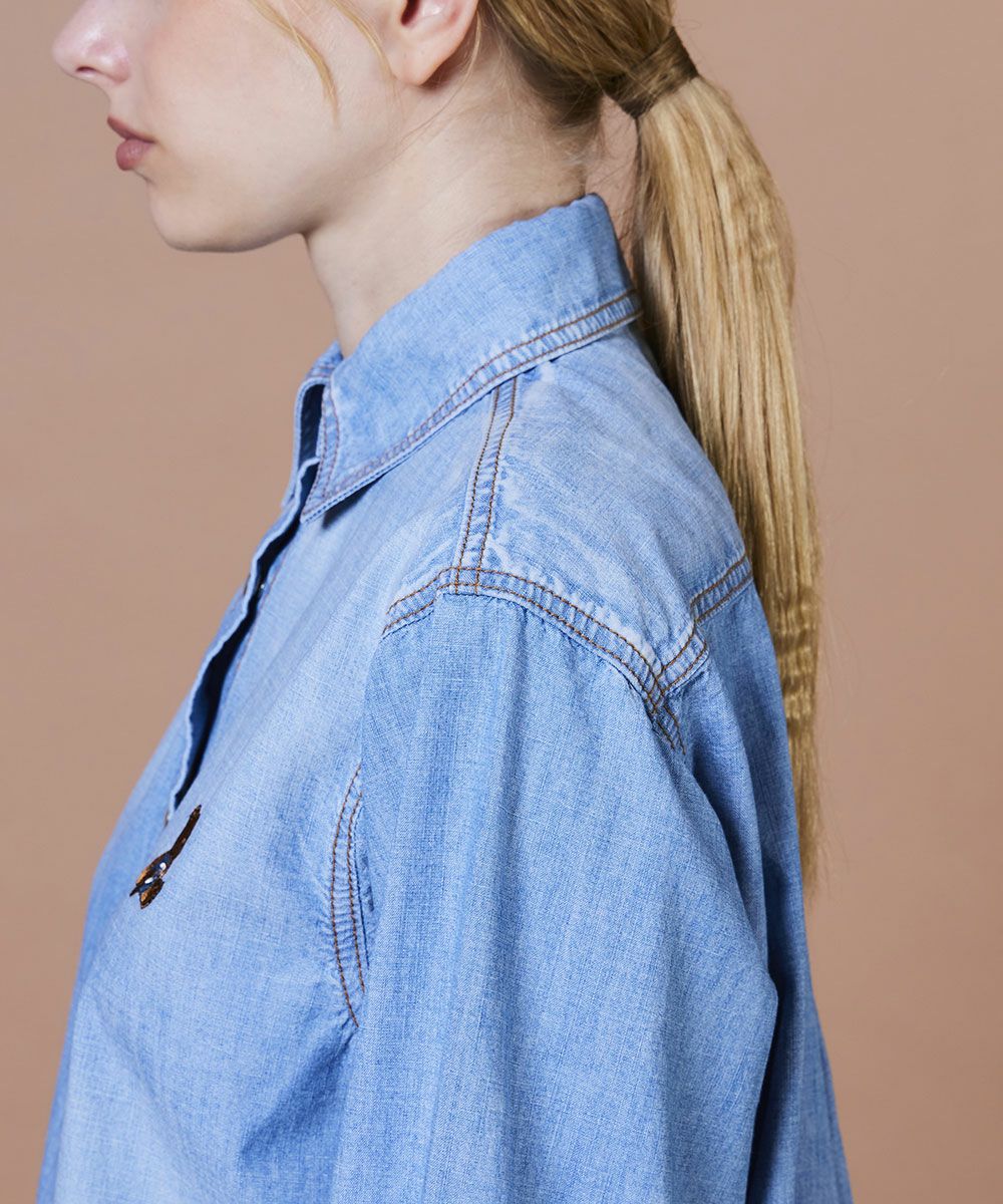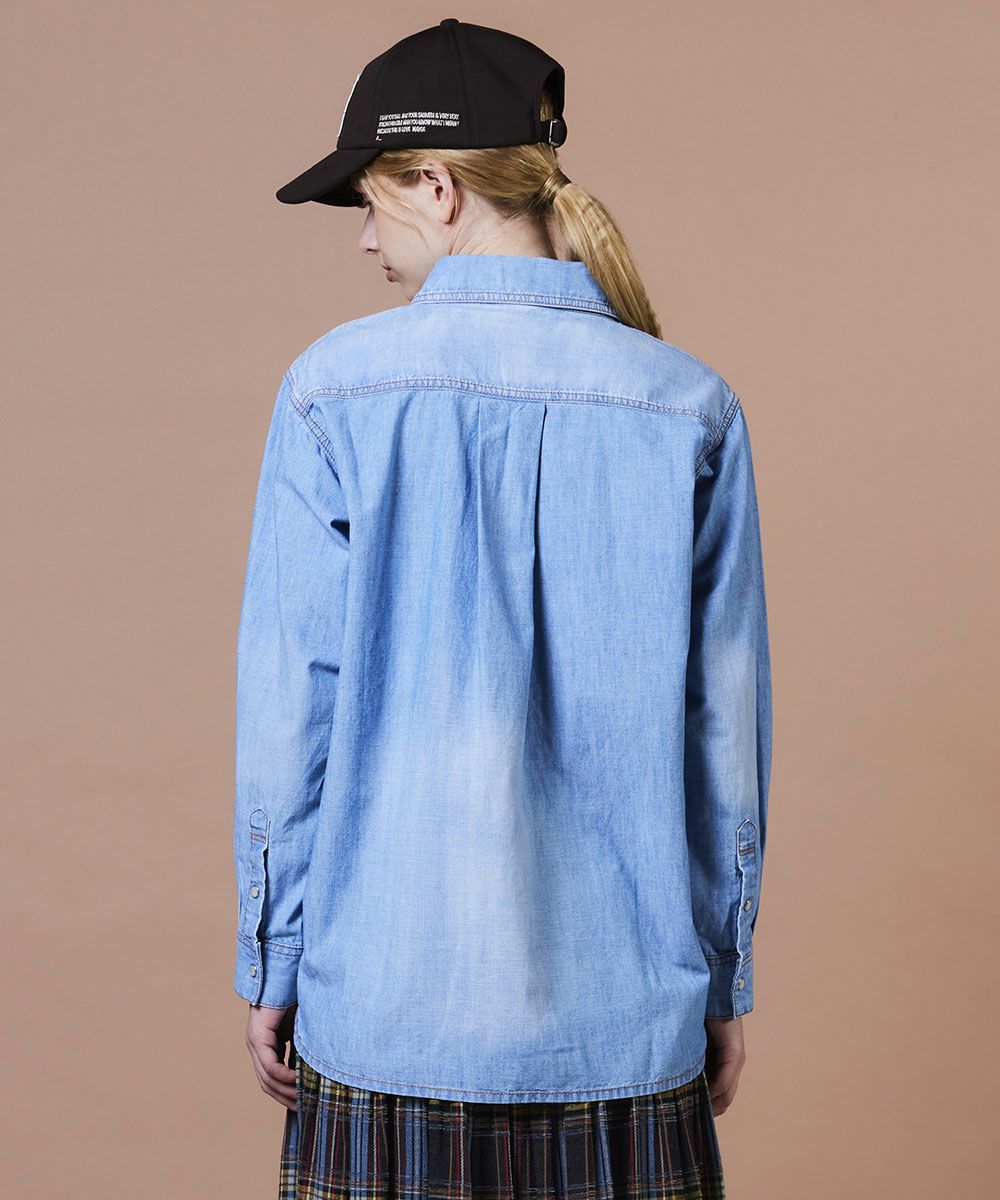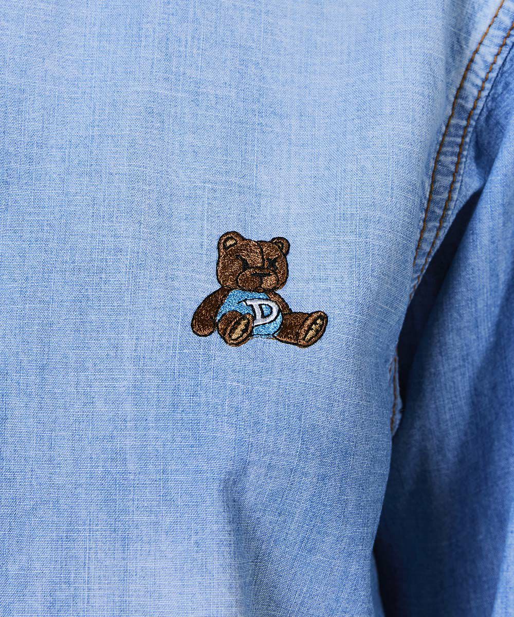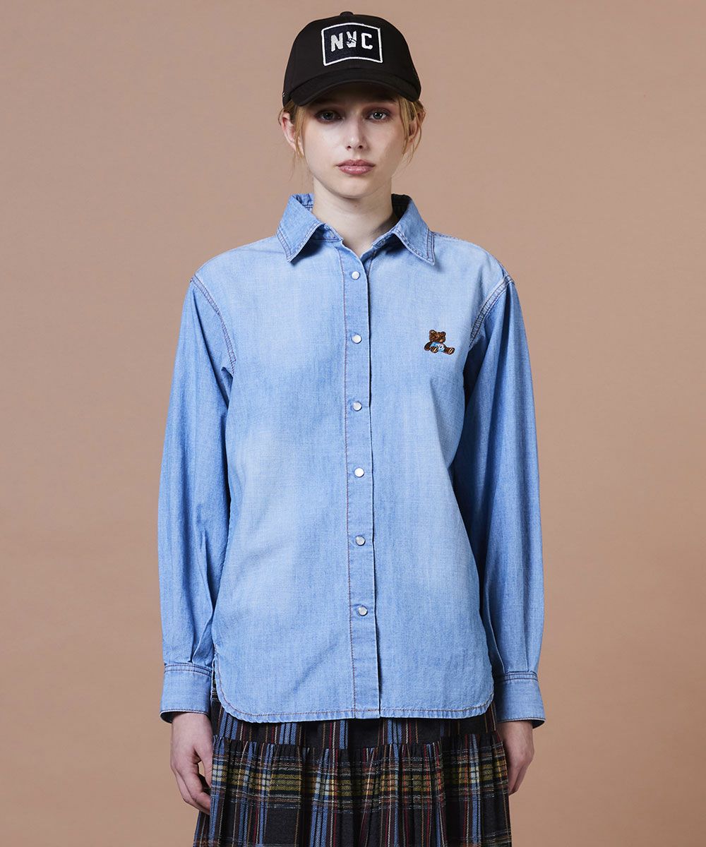 빈티지한 느낌이 매력적인 데님 셔츠. 가볍고 통기성이 좋은 샴브레이 원단에 수작업으로 정성스럽게 색바램 가공을 하여, 리얼한 사용감을 표현했습니다. 가슴부분에는 오리지널 캐릭터의 자수를 장식해, 장난기를 플러스. 심플하면서도 존재감 있는 한 장은, 한장만 입기에도 좋고, 걸쳐입기에도 활약하는 착용력이 높은 아이템입니다.