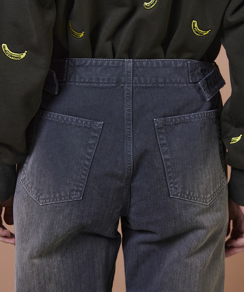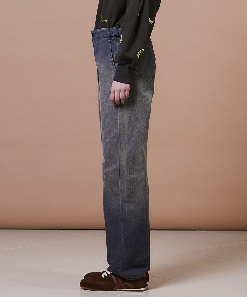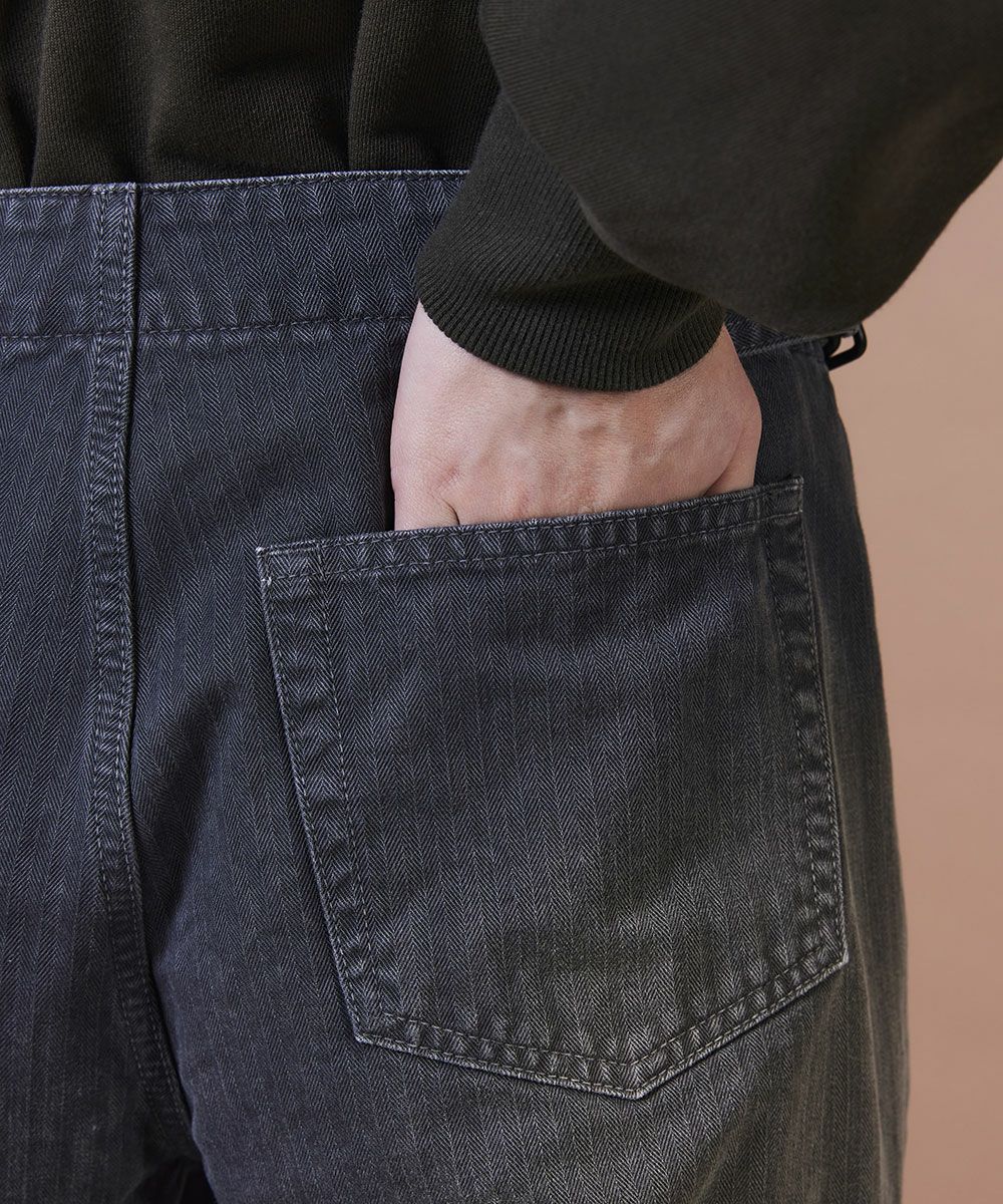 짜임이 아름다운 헤링본 원단을 사용한 팬츠. 하나하나 수작업으로 가공하여 빈티지한 느낌과 깊이감이 있는 대비로 마무리했습니다. 너무 캐쥬얼하지 않고 예쁘게 착용할 수 있는 것도 포인트. 스웨트와 함께 세련된 러프 스타일에, 셔츠와 함께 깔끔하게 입는 것도 추천합니다.