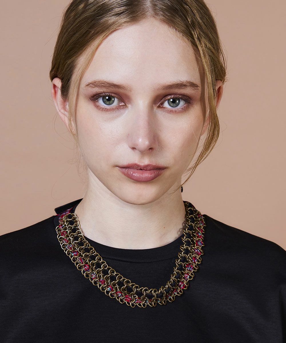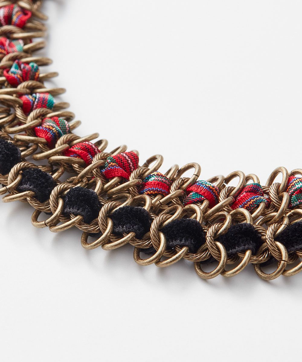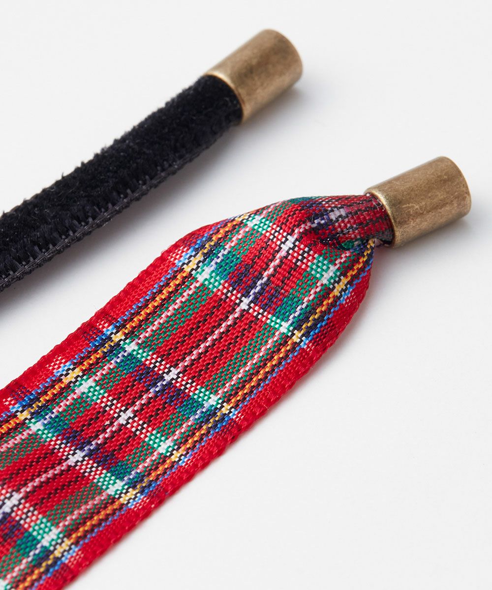 빈티지한 느낌 물씬 풍기는 존재감 가득한 목걸이. 핸드메이드 체인에 타탄체크 패브릭과 벨벳 리본을 한 컷씩 정성스럽게 통과시켜 세세한 부분까지 신경 쓴 아이템입니다. 가방은 리본 매듭으로 묶으면, 자연스럽게 여성스러움을 연출. 심플한 톱과 매치하는 것만으로 화려함을 더해주는 목걸이입니다.