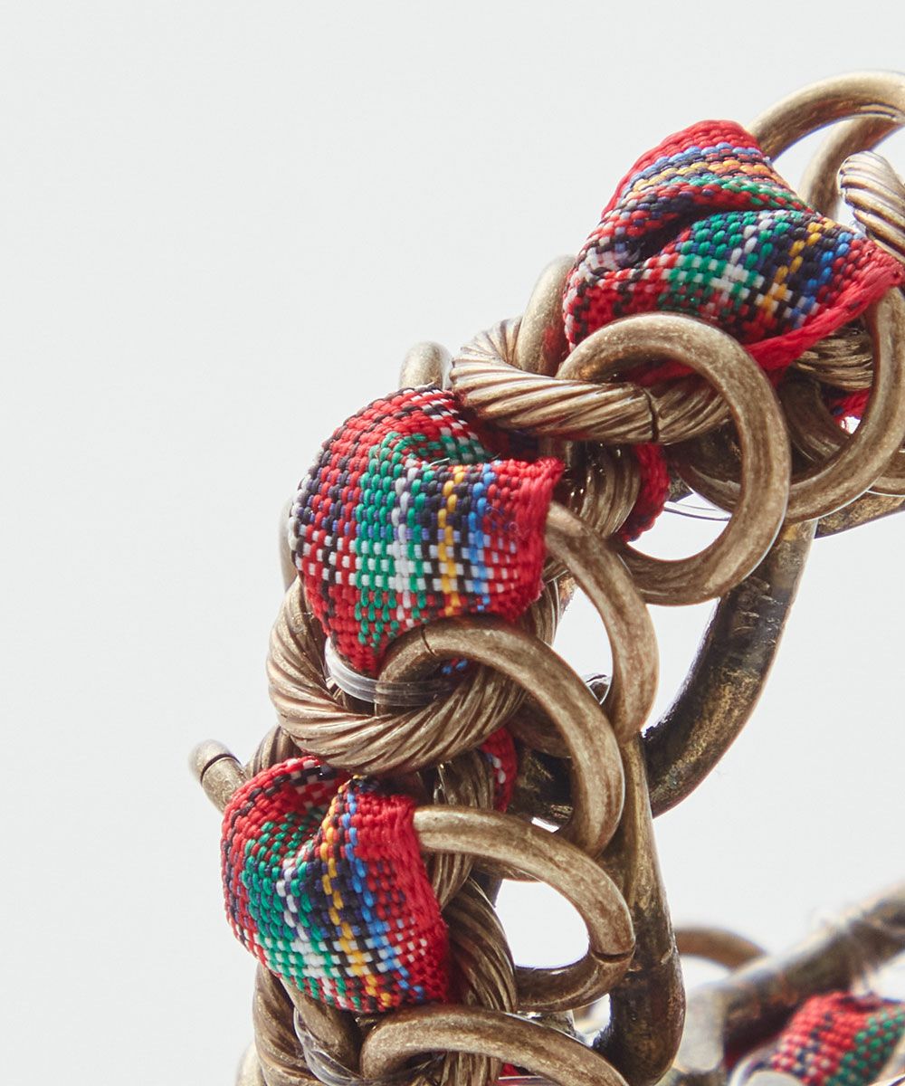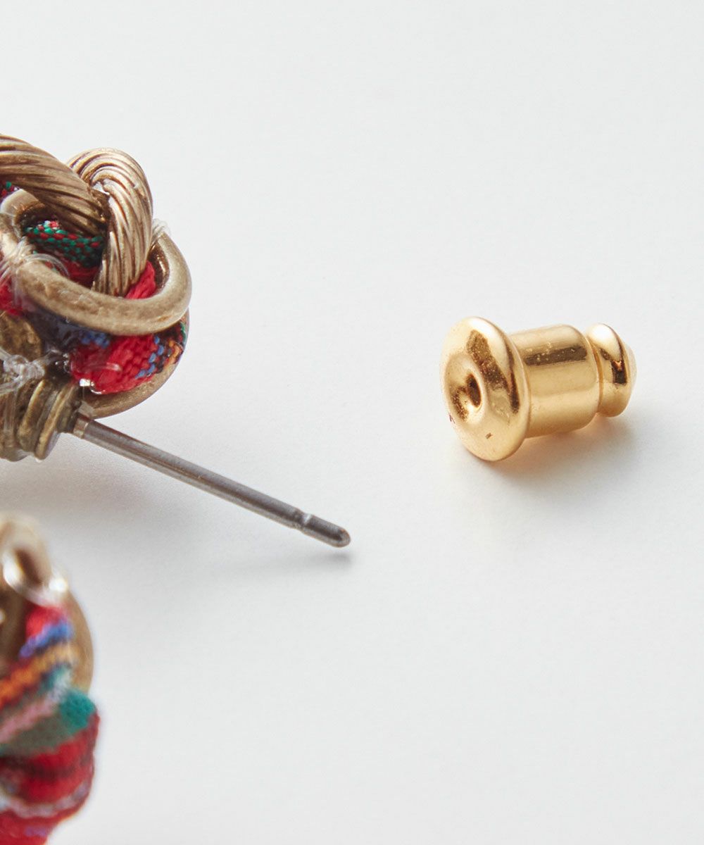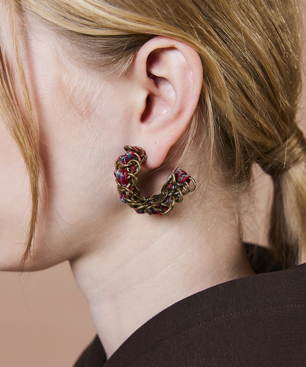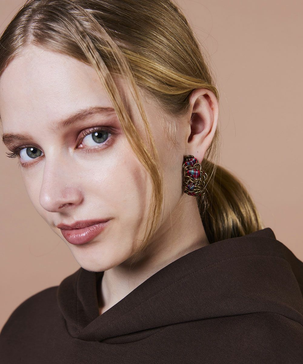 골드×빨간색 타탄체크가 조합된 존재감이 뛰어난 피어스. 핸드메이드 체인에 패브릭 리본을 한 컷씩 정성스럽게 통과시킨 세세한 부분까지 엄선한 디자인이 매력입니다. 체인에는 도금 가공을 하여 적당히 앤티크 느낌을 플러스. 큼직한 실루엣이 얼굴 주위를 화려하게 장식해, 심플한 코디의 포인트로도 활약합니다.