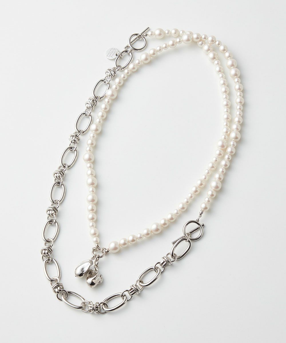 우아한 담수 펄과 샤프한 실버 체인을 조합한 롱 목걸이. 120cm를 넘는 길이이기 때문에 비스듬하게 하거나, 2줄 · 3줄로 하여 볼륨감을 내거나 등 다양한 변화를 즐길 수 있는 3WAY 사양입니다. 걸쇠를 분리하여 2개의 목걸이로도 사용할 수 있으며 코디에 맞춰 사용할 수 있는 것도 매력. 캐주얼부터 포멀까지 다양한 장면에 활약하는 아이템입니다.