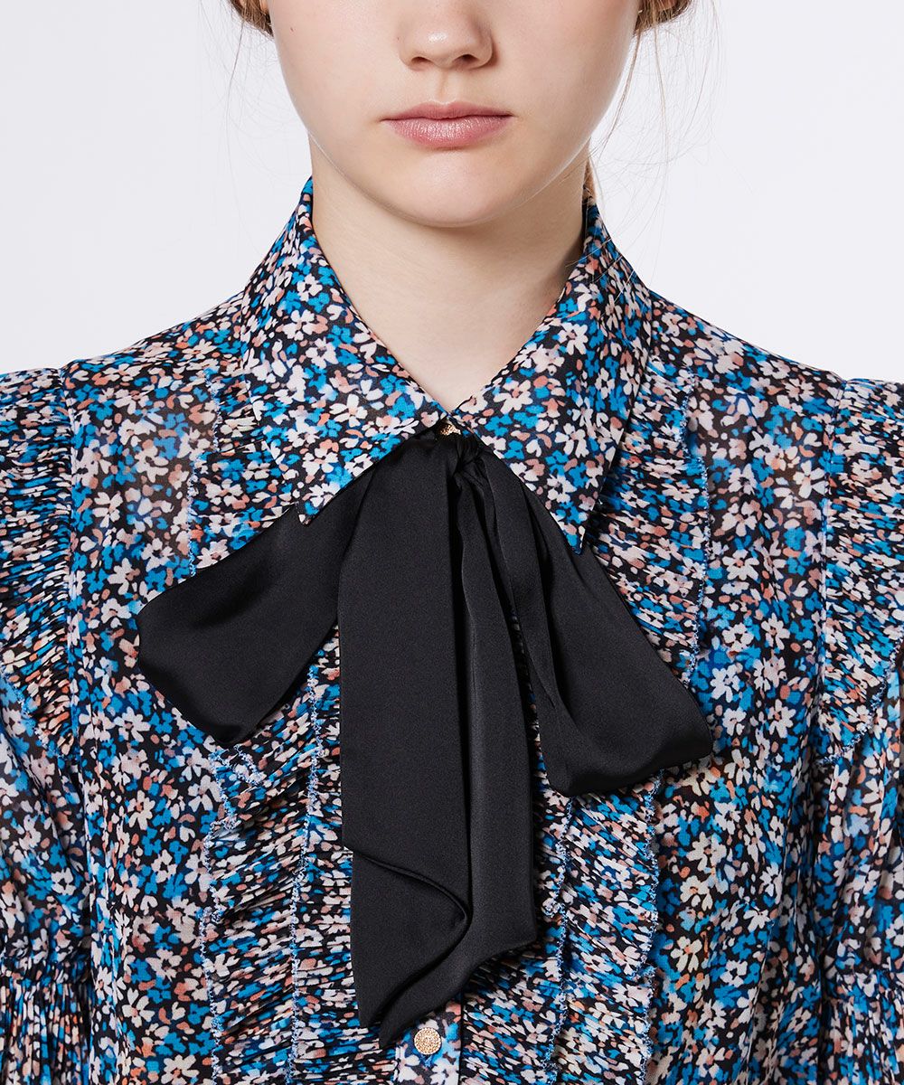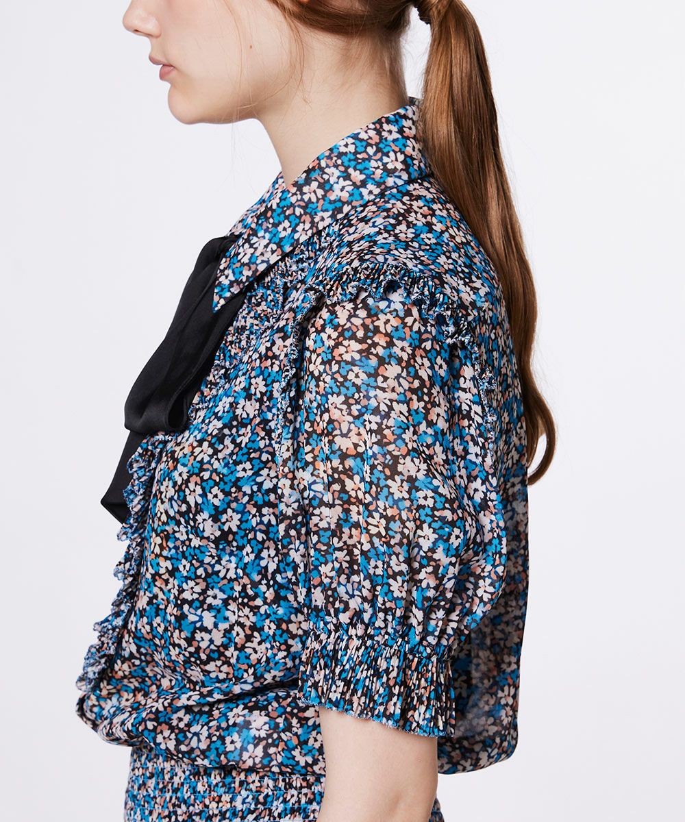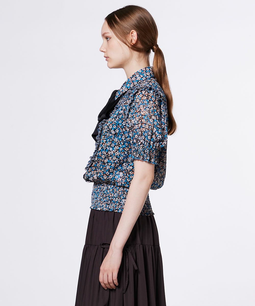 전면에 장식된 작은 꽃무늬와 검은색 리본이 클래식한 무드를 연출하는 쉬폰 블라우스. 가벼운 소재감이 여성스러운 부드러움을 돋보이게 합니다. 가슴과 소맷단에는 넉넉하게 주름을 잡아 화려한 표정으로. 롱 스커트로 페미닌하게 심플한 하의와 함께 편하게 착용하는 것도 추천합니다.