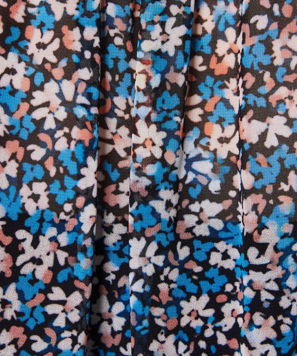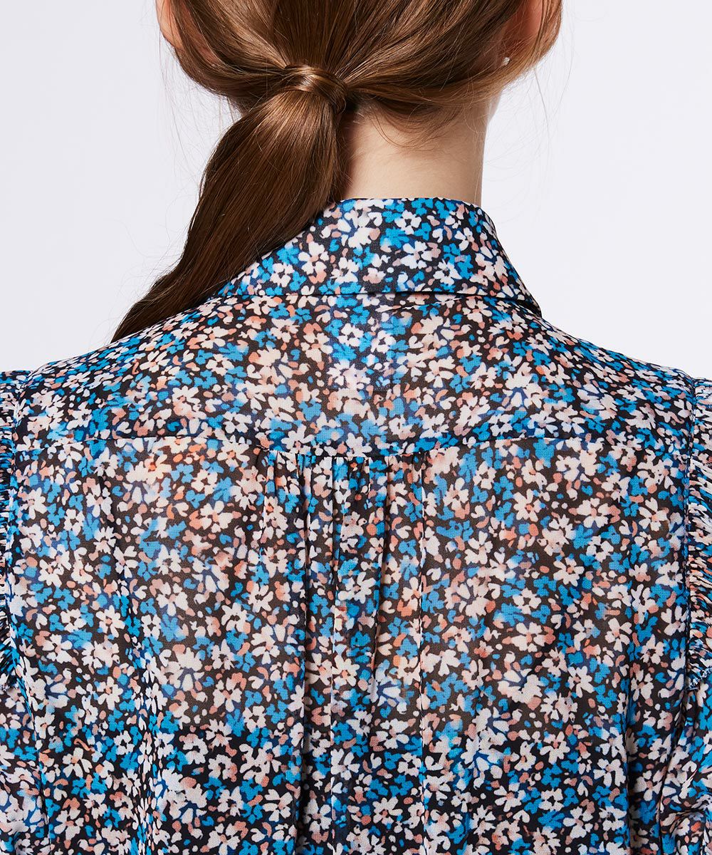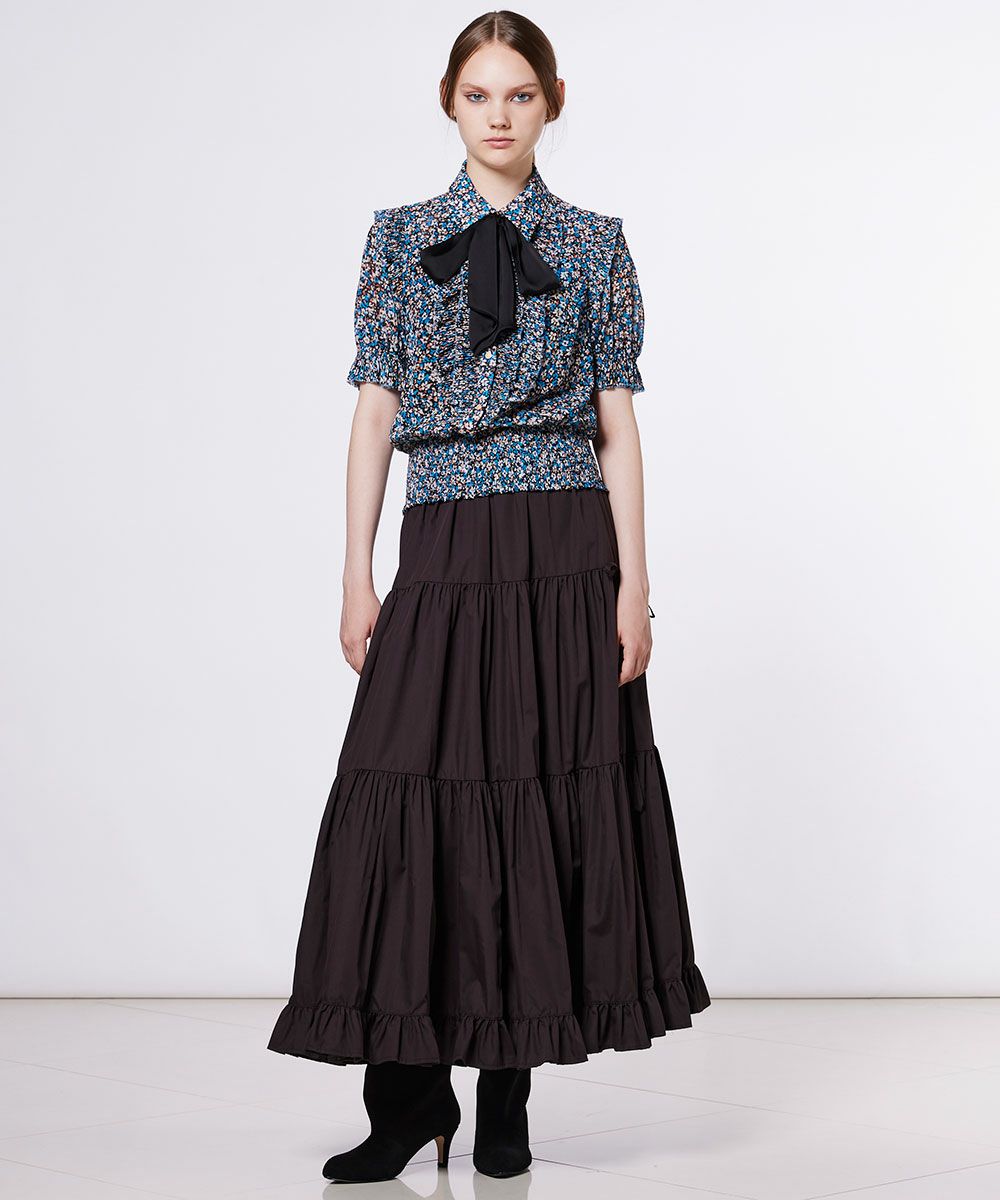 전면에 장식된 작은 꽃무늬와 검은색 리본이 클래식한 무드를 연출하는 쉬폰 블라우스. 가벼운 소재감이 여성스러운 부드러움을 돋보이게 합니다. 가슴과 소맷단에는 넉넉하게 주름을 잡아 화려한 표정으로. 롱 스커트로 페미닌하게 심플한 하의와 함께 편하게 착용하는 것도 추천합니다.