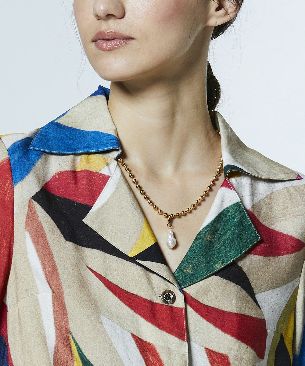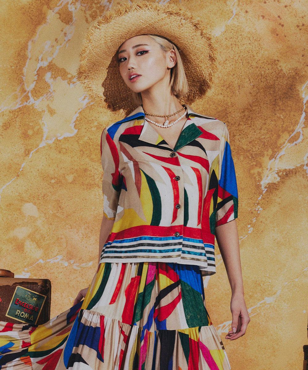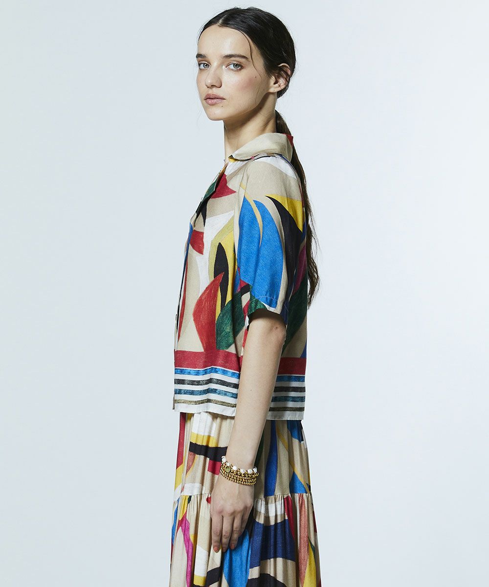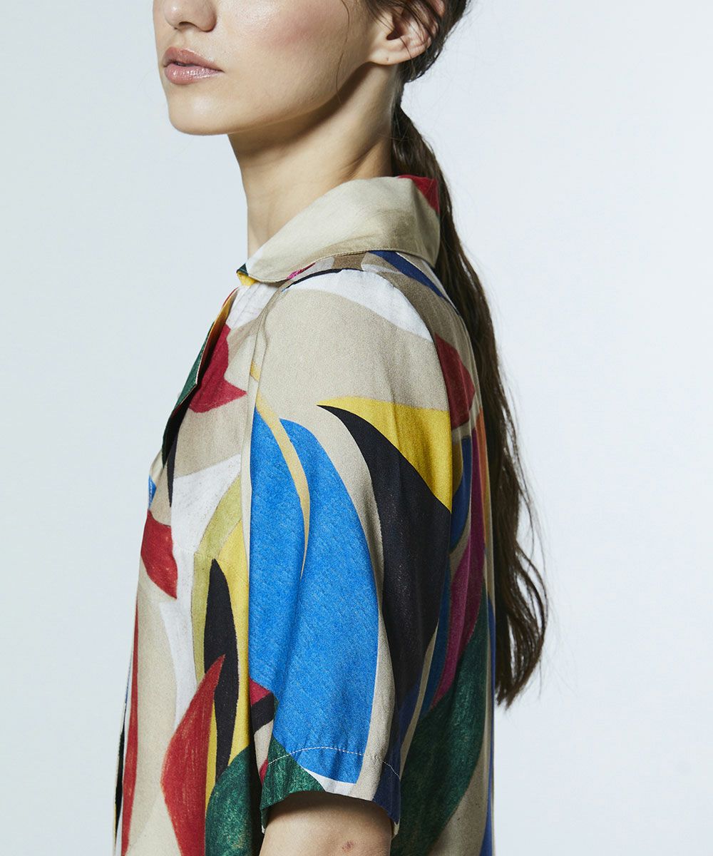 존재감 있는 컬러풀한 무늬가 눈길을 끄는 셔츠. 부드러운 흐름감과 드레이프성, 유연한 촉감과 고급스러운 광택을 겸비한 레이온 소재를 사용해 우아한 분위기로 완성했습니다. 오픈 칼라 디자인으로 자연스러운 멋을 연출합니다. 같은 소재의 스커트(모델 번호: 0202491261)와 매치하면 개성이 돋보이는 원피스 스타일링을 즐길 수 있습니다.