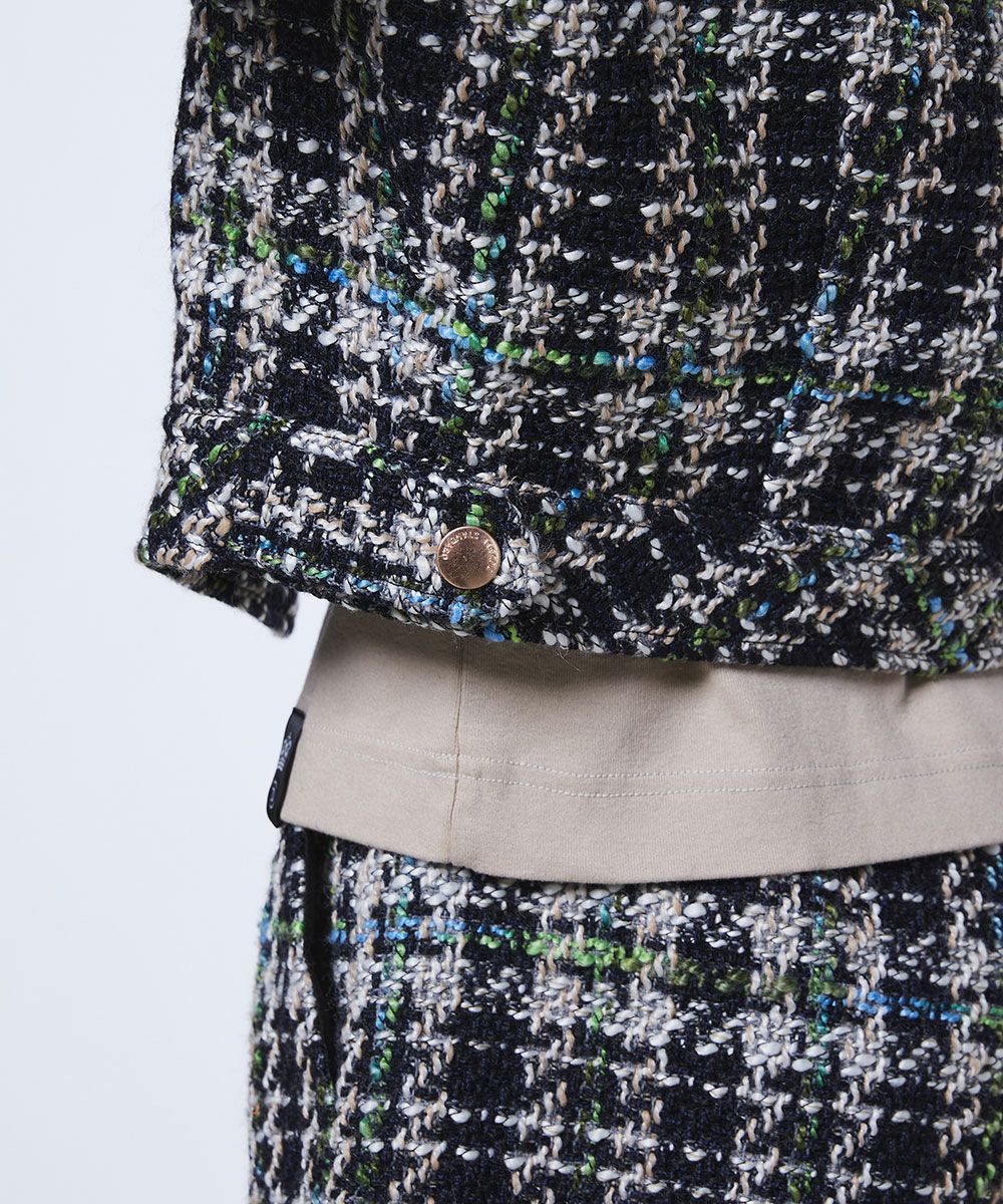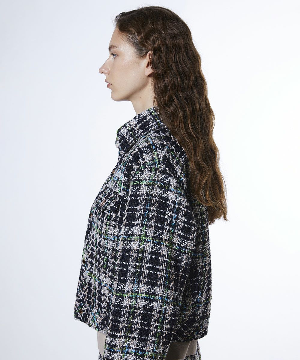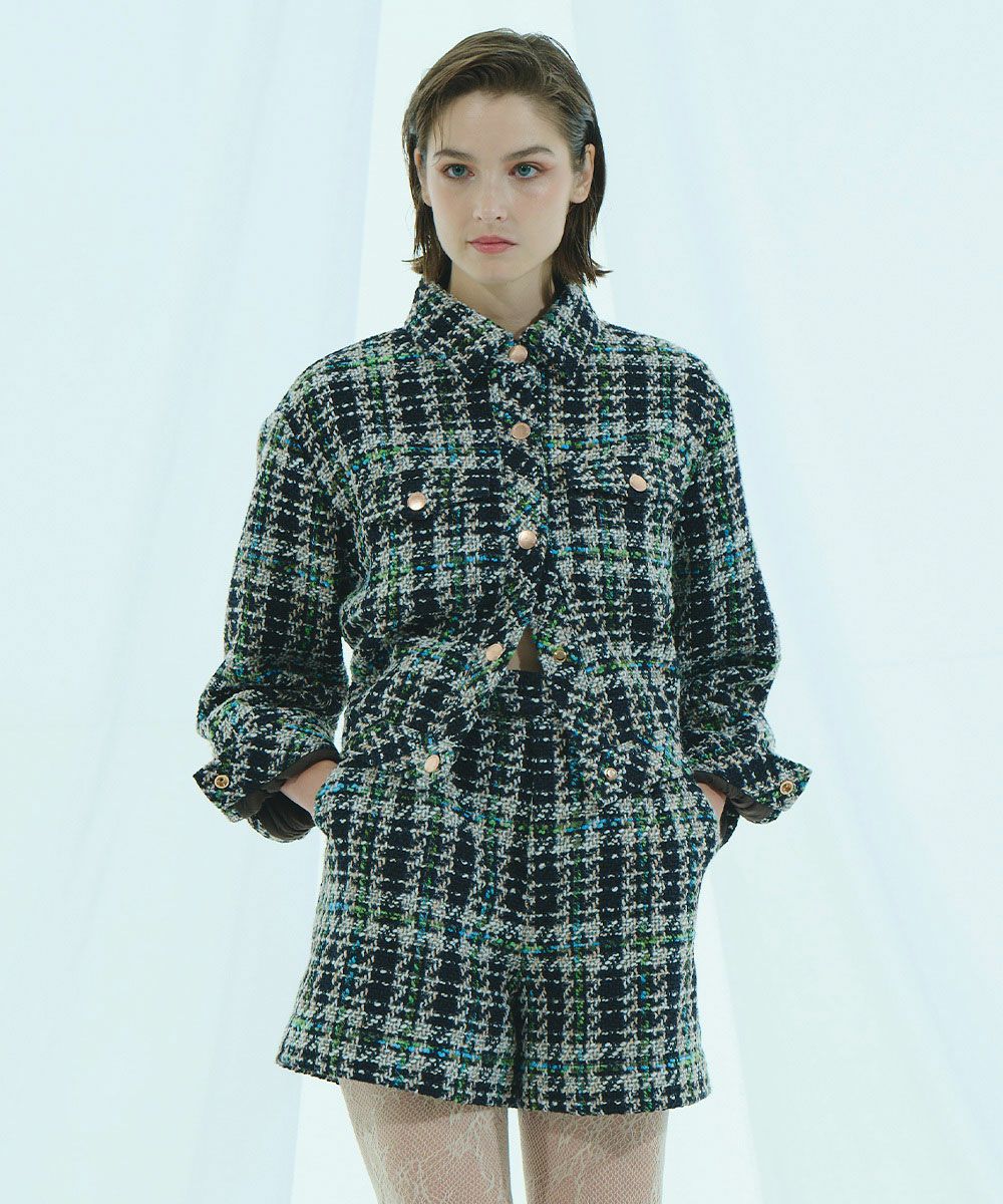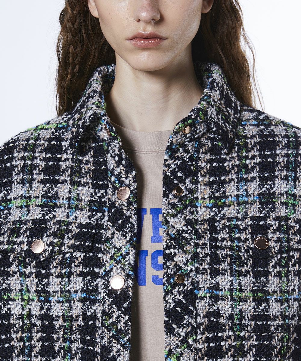 클래식한 분위기가 매력인 트위드 재킷. 캐주얼해지기 쉬운 셔츠 블루종도 트위드 소재로 제작해 고급스러움이 돋보이며 어른스러움의 여유를 느낄 수 있는 한 벌로 완성했습니다. 광택감있는 그린과 블루를 포인트 컬러로 활용해 화사한 악센트를 플러스. 한 장만 입어도 돋보이며 고급스럽고 세련된 스타일링을 완성합니다.
