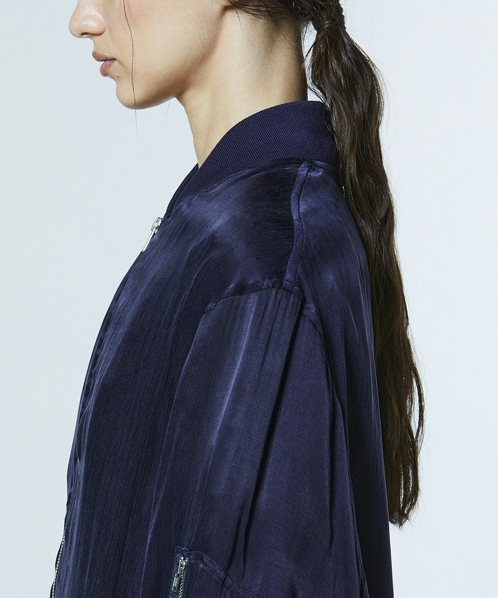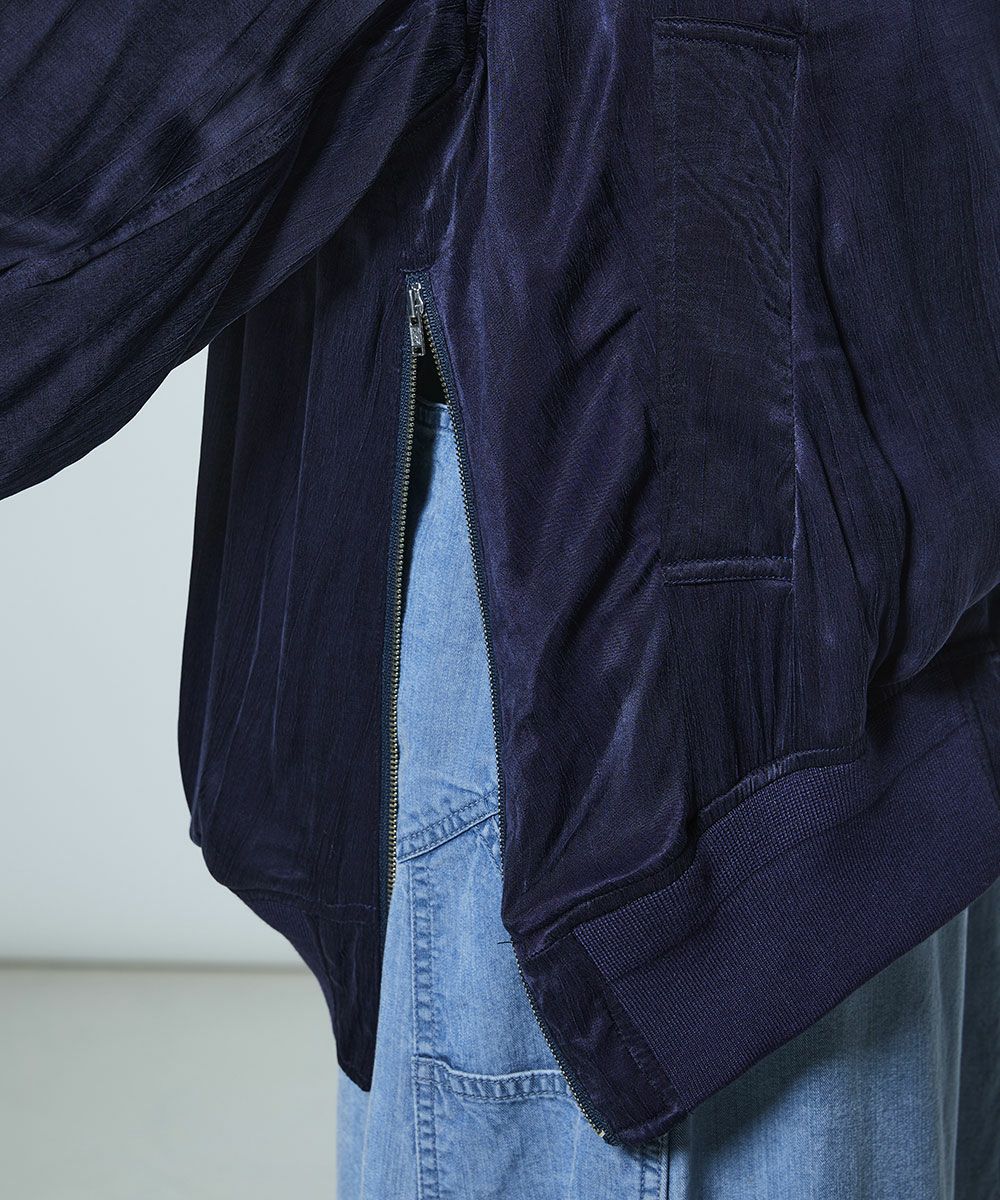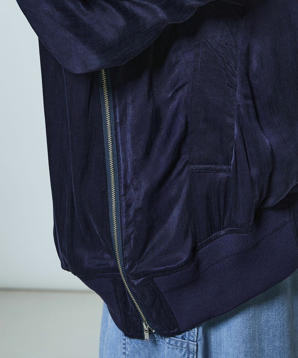 고급스러운 광택감이 매력인 새틴 소재를 사용한 블루종. 워셔 가공을 적용해 적당히 자연스러운 느낌을 더했습니다. 여유로운 실루엣이 허리 주변을 자연스럽게 가려주어, 편안한 착용감을 제공합니다. 캐주얼한 하의와 매치하면 적당히 여성스러움을 더한 스타일링을 즐길 수 있습니다.